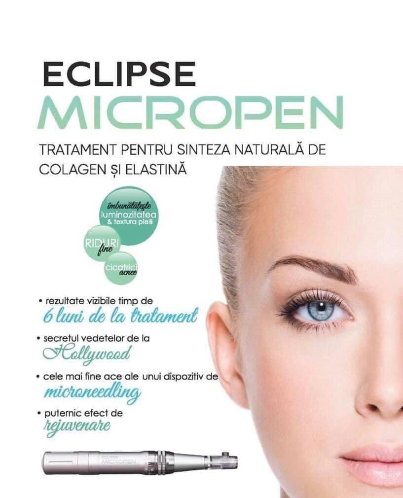 MICROPEN ECLIPSE - revolutionara tehnologie facială ce are ca rezultate: eliminarea ridurilor fine, tratarea acneei și a cicatricilor, reducerea vergeturilor și îmbunatățirea texturii generale a pielii. Este o procedura minim invazivă de rejuvenare ce folosește un sistem de microleziuni punctiforme cu ajutorul unor ace foarte fine de aur 24K.